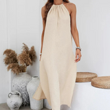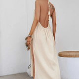 Les bretelles fines et le dos nu subtilement noué apportent une touche de féminité et de modernité, faisant de cette robe une alliée idéale pour un look bohème chic et sophistiqué.
